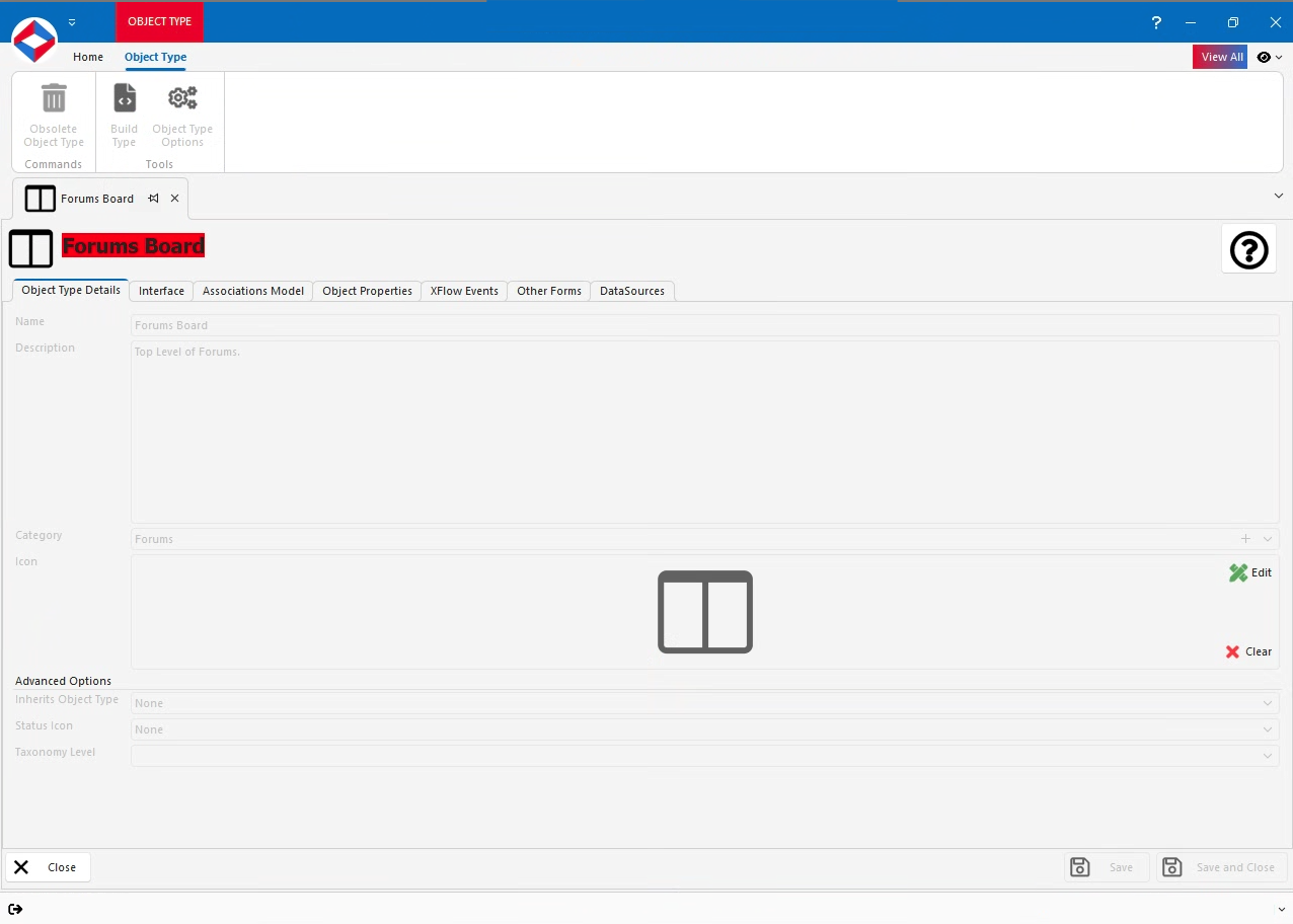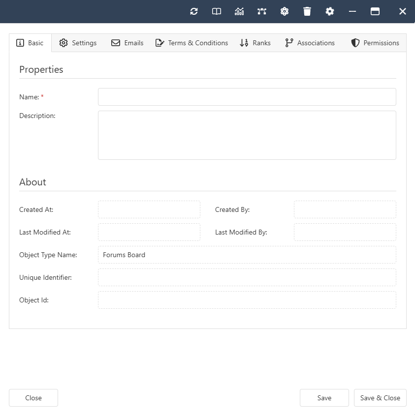 The Forums Board Object is the top level of your forum and contains a lot of the settings required to make the forum work.