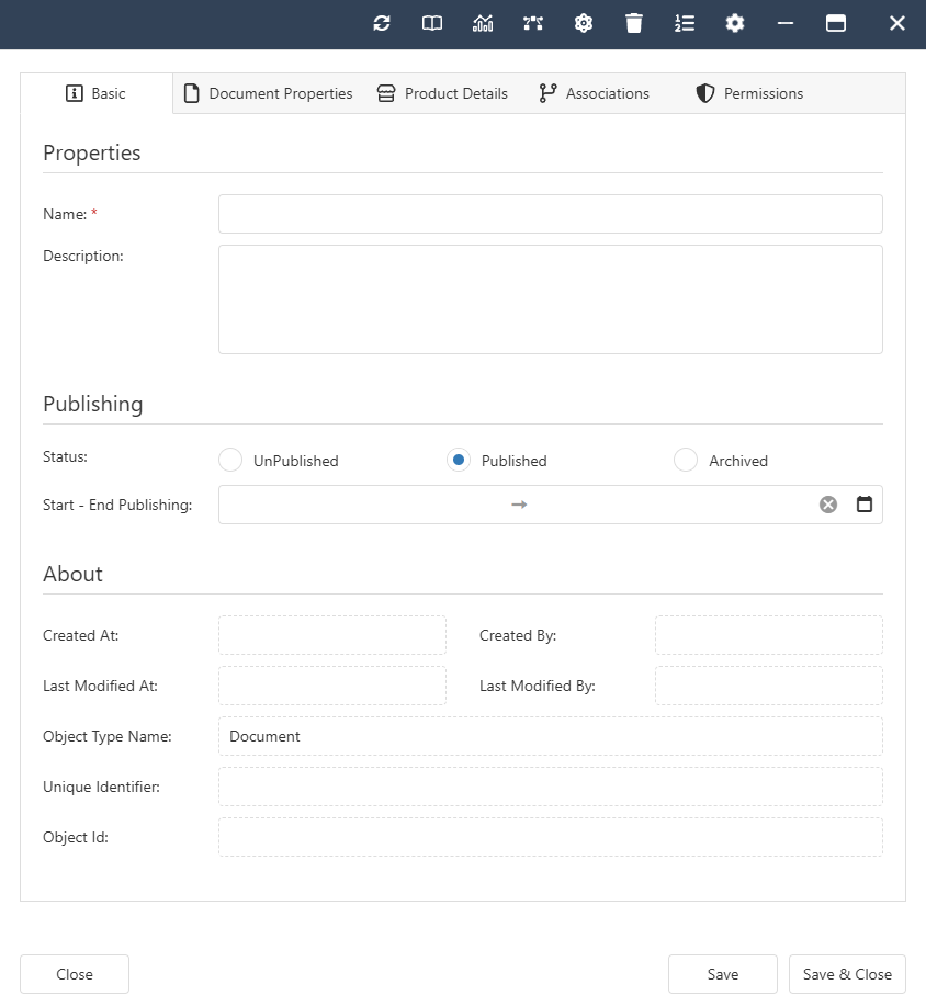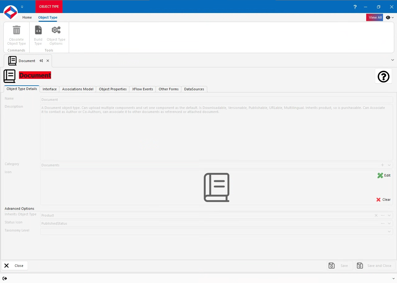 The Document object type inherits the "Product" object, making it available for e-commerce and stock control.